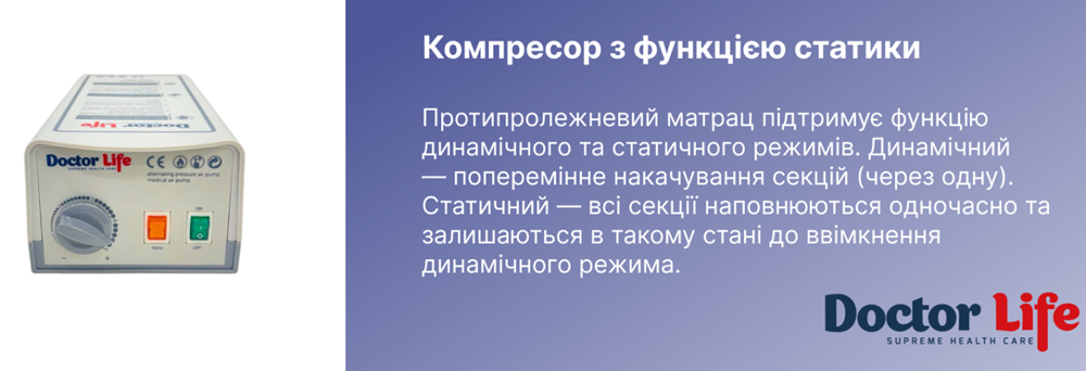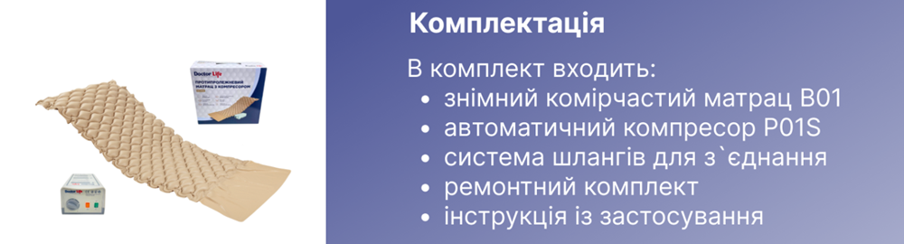 - Doctor Life B01-P01S — это эффективный противопролежневый матрас ячеистой конструкции, предназначенный для профилактики и лечения пролежней I–II степени. Идеально подходит для лежачих пациентов как в медицинских учреждениях, так и в домашних условиях — особенно при поражениях опорно-двигательного аппарата, ЦНС или тяжелых хронических заболеваниях, сопровождающихся длительным пребыванием в неподвижном положении.