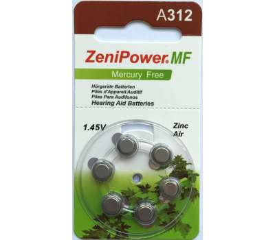 Батарейки A312 для слухового аппарата ZeniPower, 6 шт