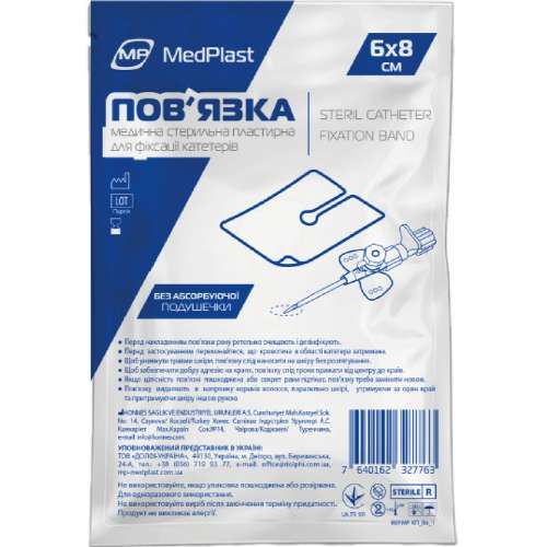 - Стерильные пластырные катетерные повязки MedPlast снабжены клеящимся слоем на основе синтетического каучука, отверстием для вывода катетера и мягким нетканым материалом для фиксации канюль.