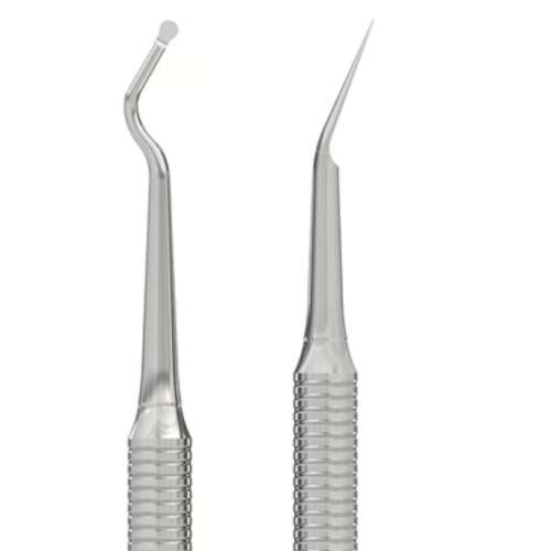 Анатомический изгиб рабочей части повторяет форму ногтевой пластины, а пика в виде изогнутого шипа очищает подногтевой и околоногтевой пространство.