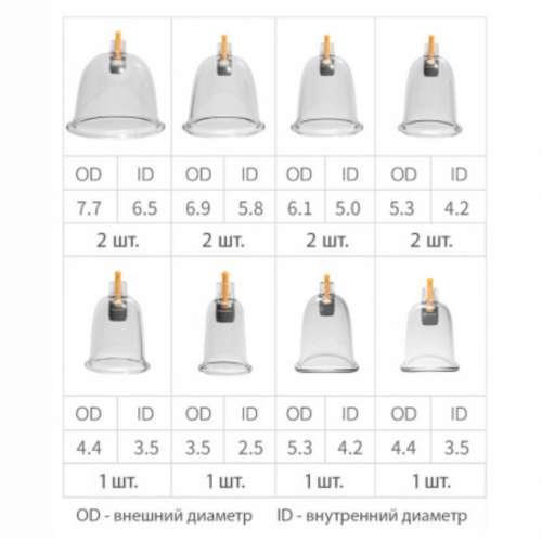 - 12 банок разных размеров — от 3 до 8 см, что позволяет работать с различными зонами тела.