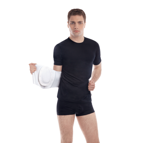 - Одевается ремнем на талию. Фиксируется на спине с помощью текстильной застежки, выпуклым элементом к пупочной грыже.