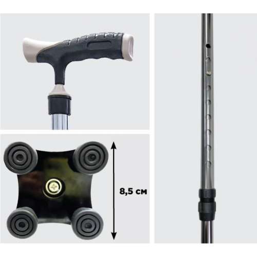 - Благодаря телескопической основе можно регулировать трость в соответствии с ростом человека. Широкое вращающееся основание имеет дополнительную устойчивость благодаря 4-м опорным ножкам на резиновых наконечниках, помогает поддерживать равновесие, когда дорожное покрытие неровное, а рельеф местности изменчив, предотвращает скольжение.