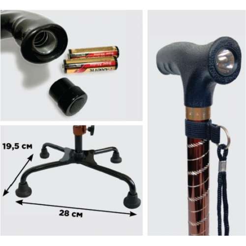 - Четырех опорная телескопическая палка с увеличенной опорой, представляет собой универсальное вспомогательное ортопедическое приспособление, используется лицами с ограниченными физическими возможностями.
