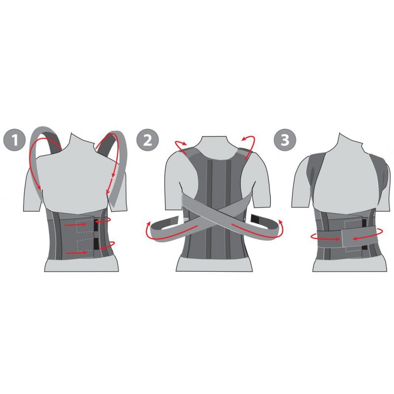 - Широкий пояс закрепляют спереди на липучую застежку, узкие эластичные ленты перекидывают вперед, обводят вокруг плеч,перекрещивают на спине и закрепляют липучей застежкой на животе, при этом корсетные вставки должны распологаться по обе стороны позвоночника.