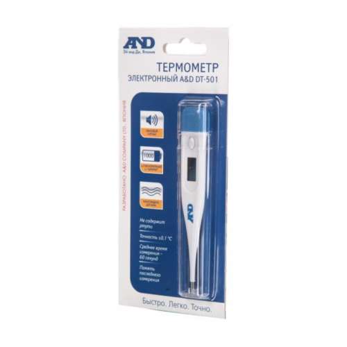 Термометр A&D DT-501 - это цифровое, современное и безопасное устройство для измерения температуры тела человека. В конструкции не содержится ртуть, опасная для жизни и здоровья человека. Термометр оборудован температурным специализированным датчиком, который гарантирует точное и быстрое измерение тепла в точке контакта с телом пациента.