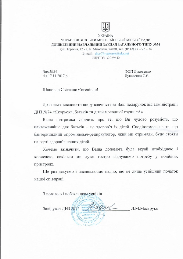 В ноябре 2016 года оказана помощь для первокласников школы интернат города Николаев: