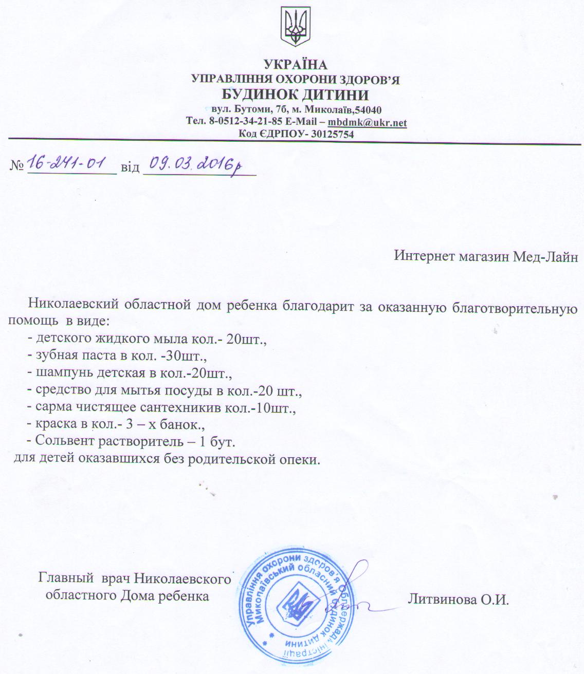 12 февраля 2016 года была оказана помощь дому малютки "Красное солнышко" в городе Николаеве, были закуплены подгузники, батарейки для детских весов, лекарственный препарат "йогурт" (бактерии) и продукты питания.