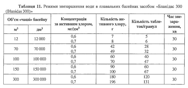 Таблица режимов очистки воды в плавательных бассейнах согласно инструкции.