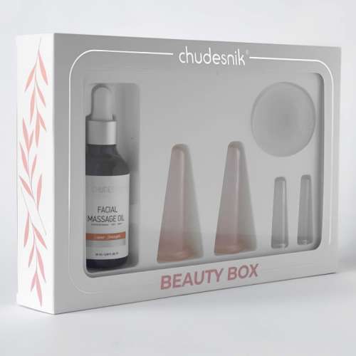 - Состав бокса: набор банок для лица и век (для лица диаметром 3 см. - 2 шт, для век диаметром 1.5 см - 2 шт), массажное масло для лица 50 мл, щеточка для умывания