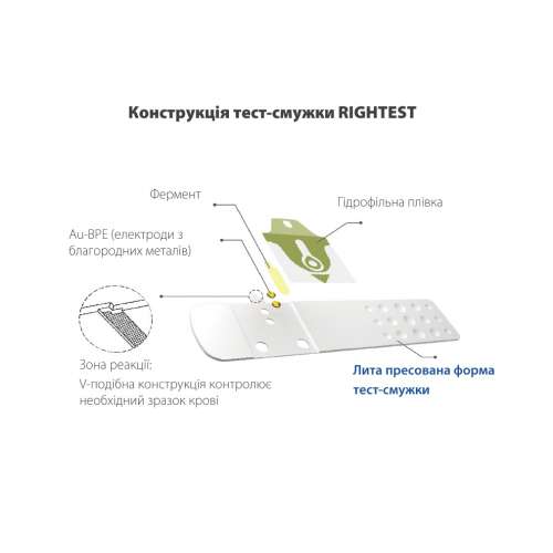 - Усовершенствованная конструкция тест-полоски Rightest - крепкая, литая форма тест-полоски без проводов обеспечивает простоту в использовании и стабильную точность.