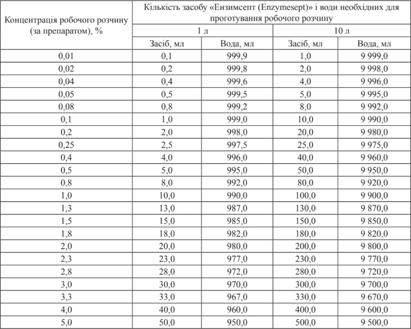 Таблица приготовления растворов Энзимсепт: