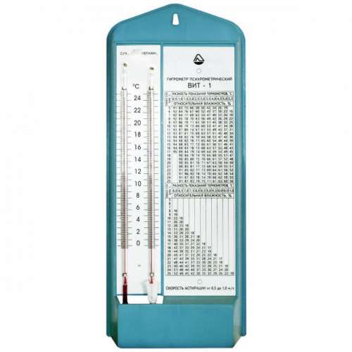 Гигрометр психрометрический ВИТ-1 состоит с пластмассового основания к которому крепятся два термометра со шкалой, психрометрическая таблица, стеклянный питатель. Резервуар термометра с надписью “Увлажненный”, увлажняется водой с питателя с помощью батистового или шифонового фитиля