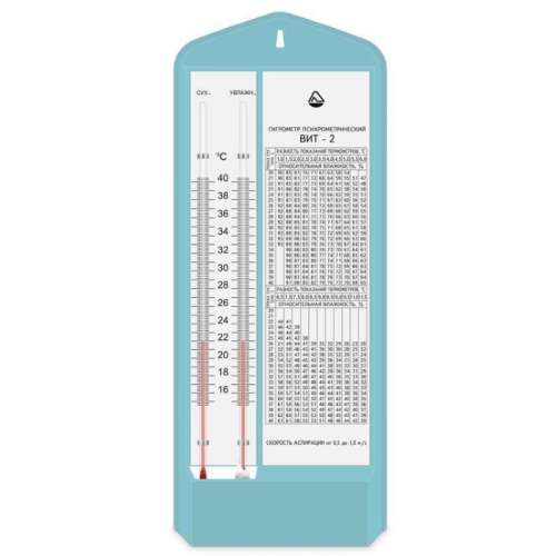Гигрометр психрометрический ВИТ-2 состоит с пластмассового основания к которому крепятся два термометра со шкалой, психрометрическая таблица, стеклянный питатель. Резервуар термометра с надписью “Увлажненный”, увлажняется водой с питателя с помощью батистового или шифонового фитиля