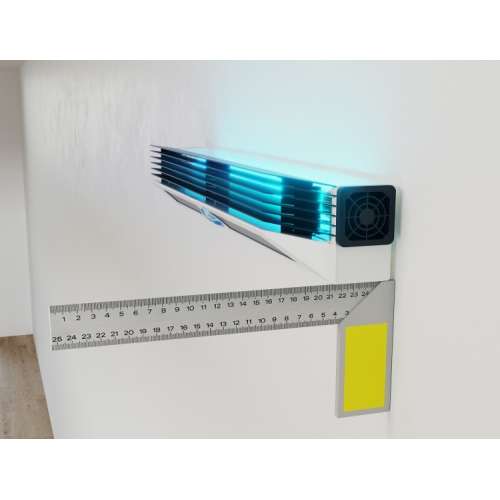 Облучатель устанавливается на перпендикулярную полу плоскость (стену) на высоте минимум от 2х метров от пола, что делает абсолютно безопасным нахождение людей в помещении.