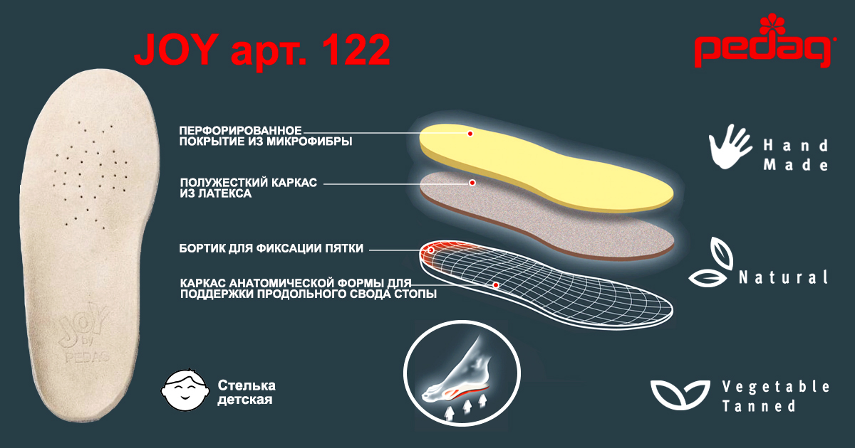 - Стелька-супинатор JOY TM Pedag изготовлена из натуральной кожи.