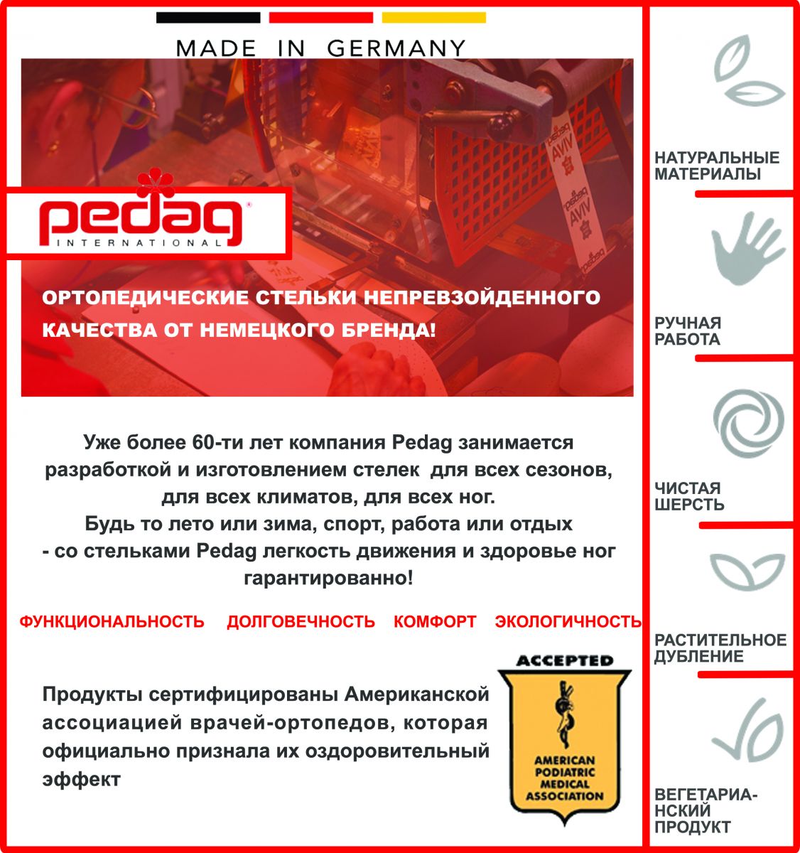 - Немецкие специалисты компании Pedag используют в процессе производства ортопедических изделий новейшие инновационные технологии, качественные и экологически чистые материалы.