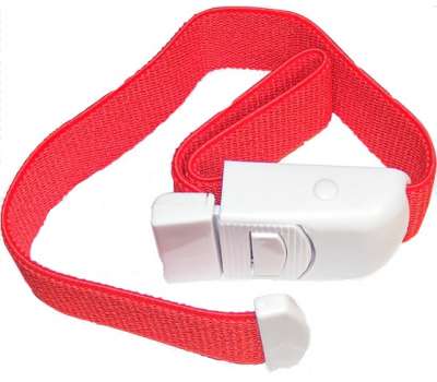 - Конструкция: трикотажная лента красного цвета и пластиковый карабин.