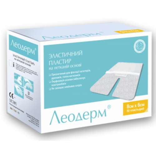 ЛЕОДЕРМ – эластичный фиксирующий пластырь на нетканой основе, предназначен для фиксации катетеров, дренажей, игл –бабочек и других медицинских устройств. Эластичная перфорированная основа и U-образный вырез обеспечивает надежную фиксацию повязки вокруг катетера.