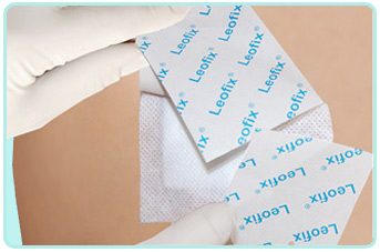 Леофикс на нетканой основе легко растягивается в двух направлениях, его можно рекомендовать для наложения повязок на подвижных участках тела. Перфорированная основа пластыря позволяет коже дышать. Для удобства в применении клеящая основа защищена специальной глянцевой бумагой, которая легко снимается перед использованием пластыря. В отличие от пластырей других производителей, основа Леофикса более эластична, и, что немаловажно, не кашлатится после наложения повязки. Кроме того, при нанесении клеевой основы нами использована новая технология, так называемое зигзагообразное нанесение полиакрилатного клея, благодаря чему воздухообмен кожных покровов увеличивается в 2 раза по сравнению с применением пластырей других производителей.