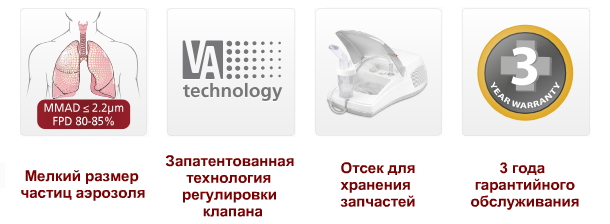 • Распылитель с технологией виртуальных клапанов для экономии лекарственного средства при выдохе. Позволяет экономить до 30% лекарсвенных средств, очень важно при использовании дорогих препаратов.