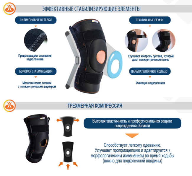 Боковую стабилизацию наколенника обеспечивают алюминиевые вставки с полицентрическим шарниром, а кольцо для надколенника, из вспененного материала, фиксирует надколенник. Благодаря сочетанию качественных материалов и надежных стабилизирующих элементов ортез эффективно снимает нагрузку с сустава, предупреждает патологические движения, обеспечивая при этом, физиологически правильное сгибание/разгибание. Наколенник плотно прилегает к телу, не создает дискомфорта и легко одевается благодаря трехмерной компрессии. Для более удобного надевания наколенник открывается сзади в нижней части голени. Хорошо подходит активным пользователям и спортсменам.