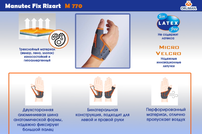 Ортез выполнен из воздухопроницаемого и влагопоглощающего инновационного трехслойного материала последнего поколения – велюр, пена, хлопок. Для обеспечения идеального микроклимата под ортезом, поверхность перфорирована. Изделие имеет современный дизайн. Система иммобилизации состоит из алюминиевой двусторонней шины, которой можно придать анатомическую форму кисти пациента. Двусторонняя конструкция может быть адаптирована как для левой, так и для правой руки. Система ремней и фиксаторов с застежками Micro-Velcro надежно закрепляют, и удерживает ортез на теле.