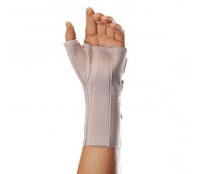 Ортез выполнен из эластичного воздухопроницаемого материала, который обеспечивает отличную циркуляцию воздуха. По тыльной поверхности располагаются ремни с прочными застежками, по ладонной поверхности располагается жесткая пластина из алюминия, пластина при необходимости поддается моделированию. Ортез обеспечивает умеренную компрессию и исключает движения в лучезапястном суставе. Длина - 18 см. Подбирается по размеру окружности запястья на правую или левую руку.