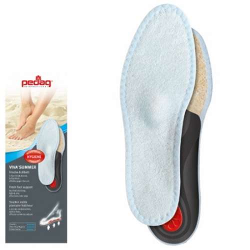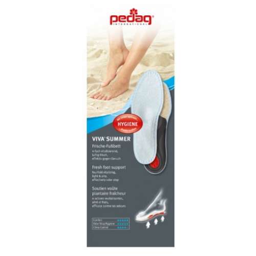 - VIVA SUMMER осуществляет надежную поддержку продольного и поперечного сводов стопы благодаря прочному пластиковому каркасу анатомической формы и плюсневой подушке. Латексная вставка-амортизатор уменьшает ударную нагрузку на пятку.