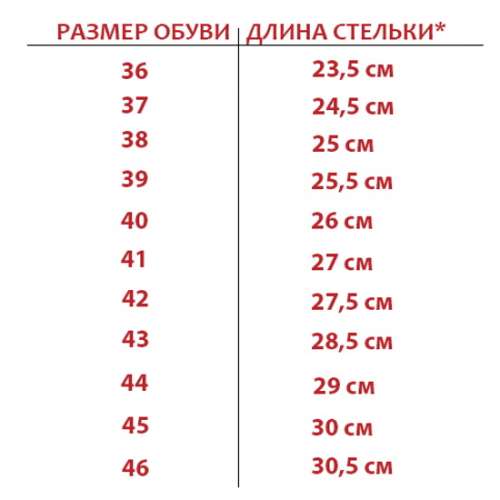 Размер обуви | 36 | 37 | 38 | 39 | 40 | 41 | 42 | 43 | 44 | 45 | 46 |