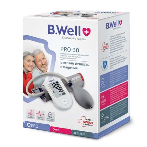 PRO-30 B.Well – это полуавтоматический тонометр с манжетой, длина которой подходит для людей с окружностью плеча от 22 до 42 см. Модель является золотой серединой между традиционными механическими и современными автоматическими тонометрами. Прибор изготовлен швейцарским производителем B.Well, он точен и выполнен из прочных материалов, имеет длительный срок службы. В комплект входит чехол, в котором удобно хранить аппарат и брать его, по необходимости, в дорогу.