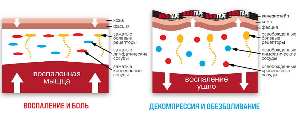 Тейпы RockTape могут использоваться спортсменами в период реабилитации, а также всеми, кто желает быстро избавиться от мышечной боли и спазмов. Буквально за 1 неделю систематического использования данных аппликаторов, проходят ушибы и большие следы от подкожных гематом.